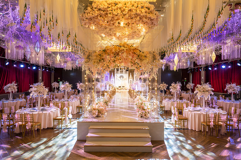 兩個宴會廳分別以浪漫溫馨的粉色系及高貴典雅的紅金為主題,均可同時容納42桌宴席。宴會廳的頂部以波浪狀的紗幔、可控燈帶、水晶條裝飾為主,頂部垂吊了近三萬根夢幻光纖絲,是當地首屈一指的一站式 5D主題婚禮大廳。