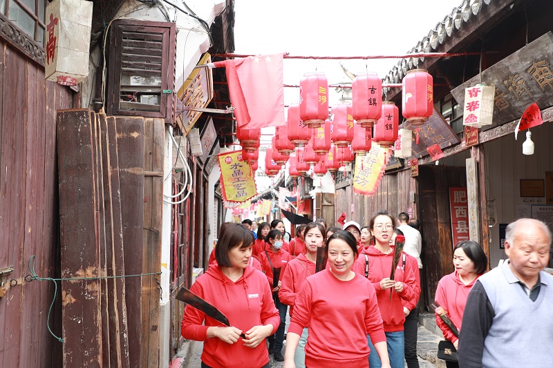三河古鎮(zhèn),地處合肥、六安、巢湖三市交界處,與舒城、廬江縣相鄰,有2500多年歷史,為肥西縣的經(jīng)濟重鎮(zhèn)。它因豐樂河、杭埠河、小南河三水交匯而得名。古街小巷僅有三米多寬的青石板路面,表面光滑,延續(xù)向前,呈現(xiàn)出它歷史之變的滄桑。走在三河小南河邊,只見兩岸座座青磚黛瓦的民居,掩映在青蔥柳綠之中,洗去了都市的喧囂與塵埃。大家盡情地享受陽光、清風、碧水,感受著節(jié)日的快樂。
